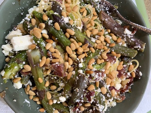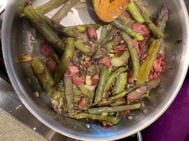 Wash and cut your asparagus into 3 inch pieces.  Add to olive oil in a saucier or a pan which you can cover and saute/steam.  Steam on medium low until starting to  soften.  Add garlic and continue to steam/fry.  In another pan, add chopped bacon and fry until just starting to brown.  Add it to the asparagus and garlic mixture and lightly brown.  Serve over angel hair pasta with feta cheese and topped with toasted pine nuts.  Add more olive oil on top if you like!
